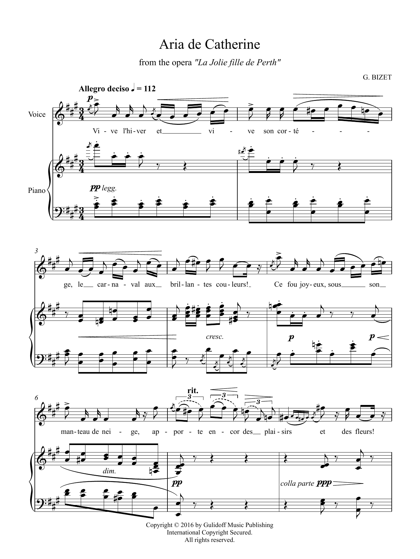 Download or print Georges Bizet 7 Songs: Aria de Catherine from the opera La Jolie fille de Perth sheet music, chords and digital score arranged for Piano & Vocal. This Classical score includes 10 page(s).