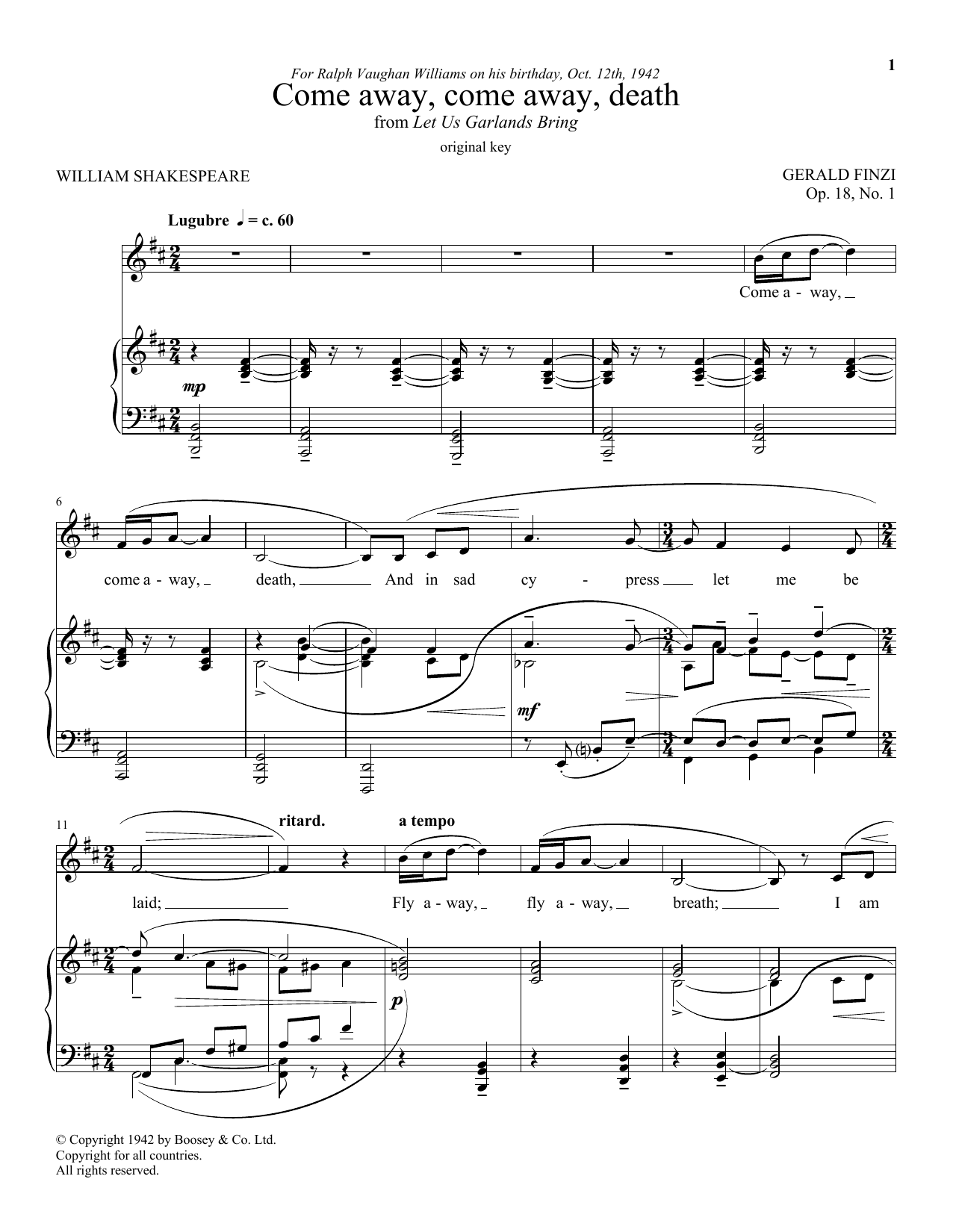 Download or print Gerald Finzi Come Away, Come Away Death sheet music, chords and digital score arranged for Piano & Vocal. This Classical score includes 4 page(s).