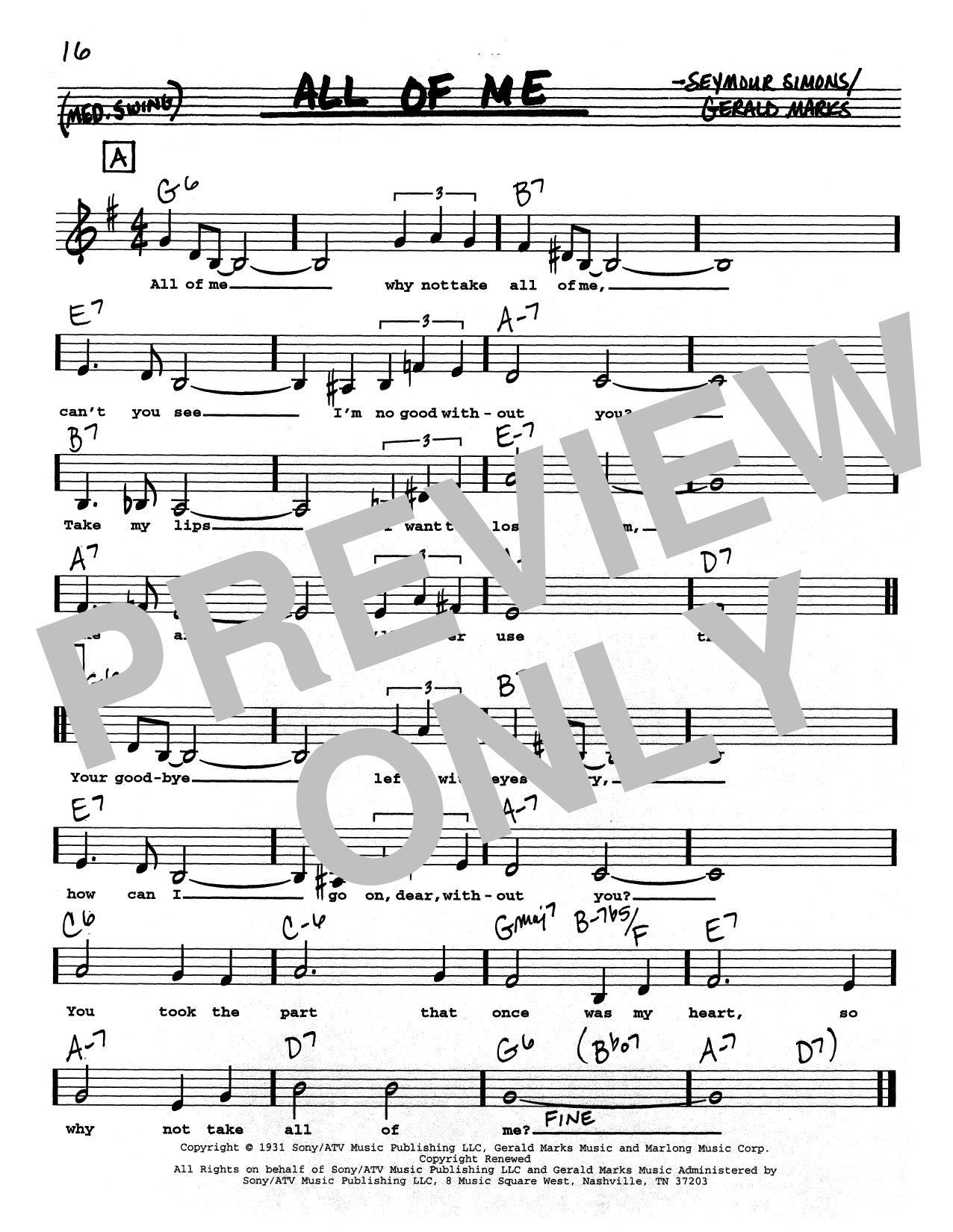 Download or print Gerald Marks All Of Me (Low Voice) sheet music, chords and digital score arranged for Real Book – Melody, Lyrics & Chords. This Jazz score includes 1 page(s).