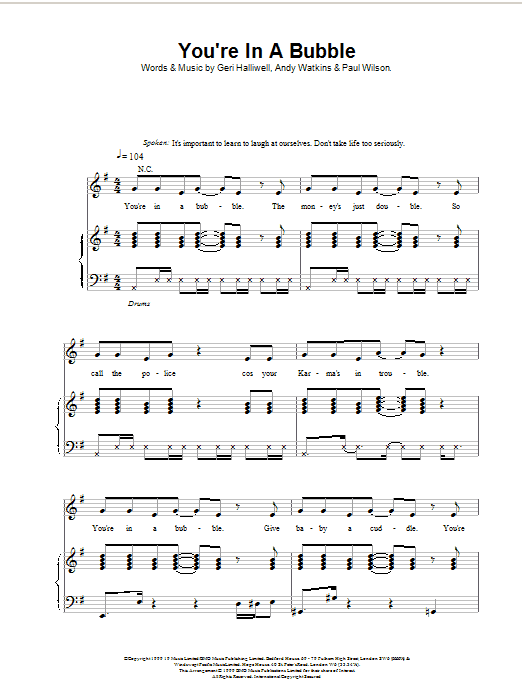 Download or print Geri Halliwell You're In A Bubble sheet music, chords and digital score arranged for Piano, Vocal & Guitar Chords. This Pop score includes 5 page(s).