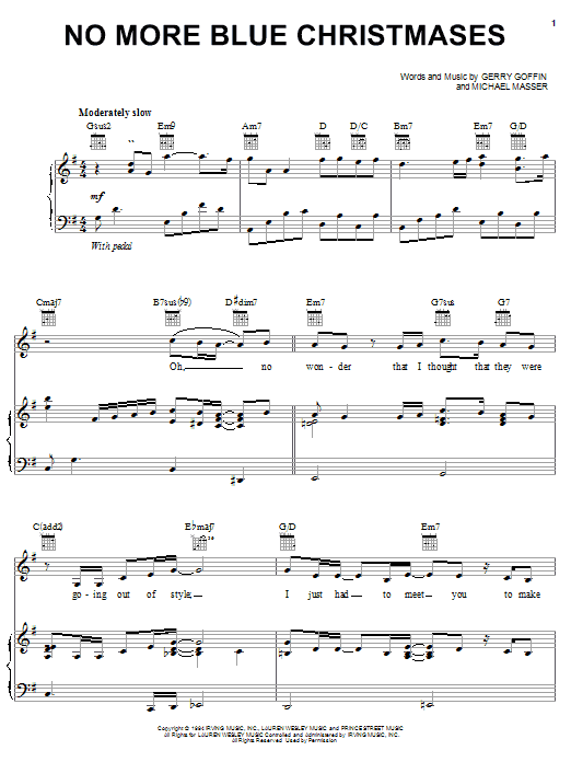 Download or print Gerry Goffin No More Blue Christmases sheet music, chords and digital score arranged for Piano, Vocal & Guitar Chords (Right-Hand Melody). This Christmas score includes 7 page(s).