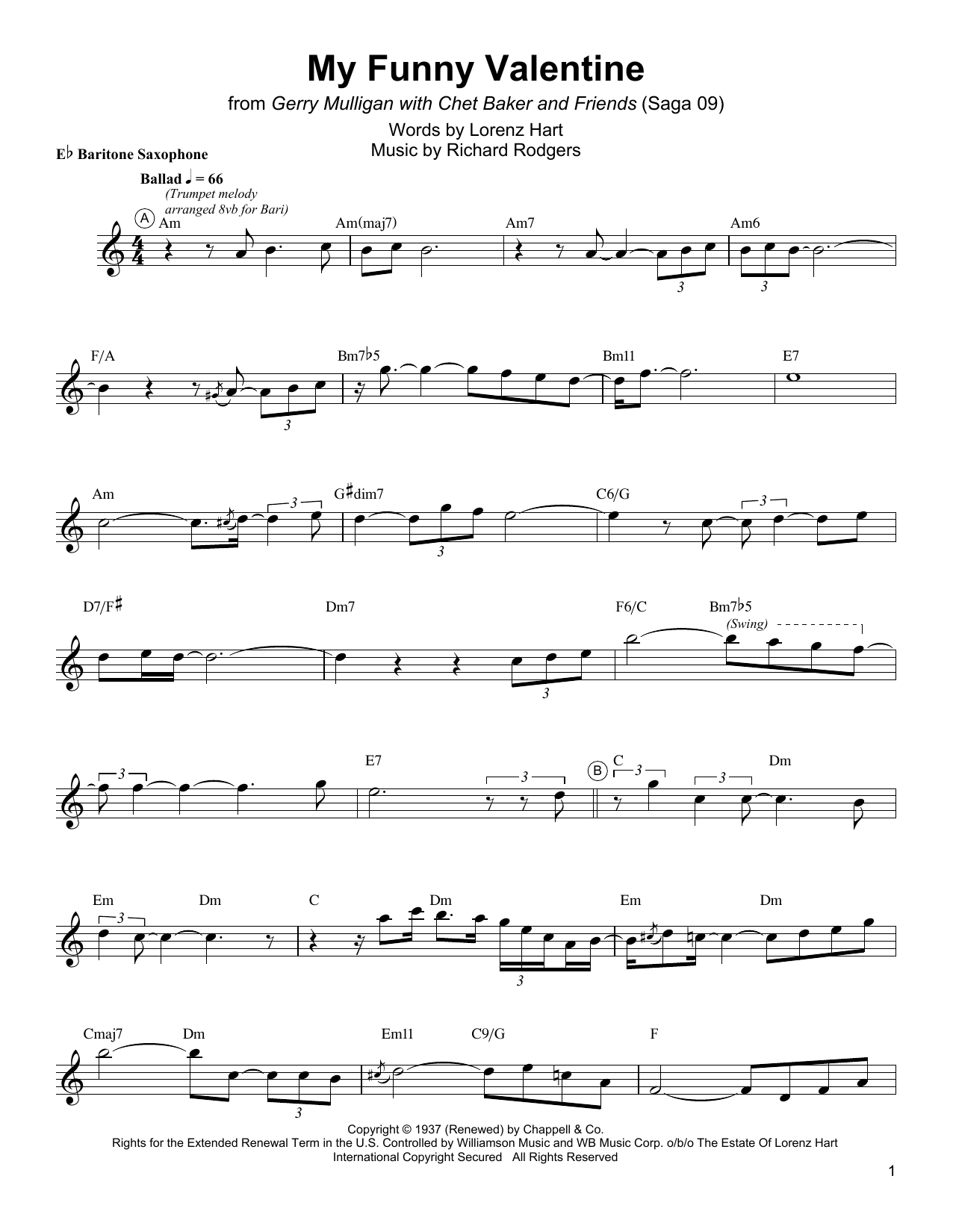 Download or print Gerry Mulligan My Funny Valentine sheet music, chords and digital score arranged for Baritone Sax Transcription. This Jazz score includes 2 page(s).