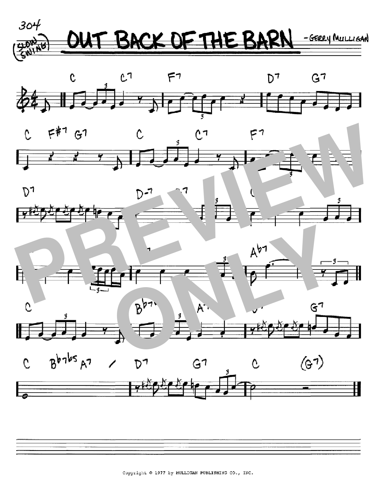 Download or print Gerry Mulligan Out Back Of The Barn sheet music, chords and digital score arranged for Real Book – Melody & Chords – C Instruments. This Jazz score includes 1 page(s).
