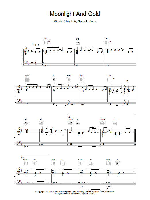 Download or print Gerry Rafferty Moonlight And Gold sheet music, chords and digital score arranged for Piano, Vocal & Guitar Chords. This Pop score includes 6 page(s).