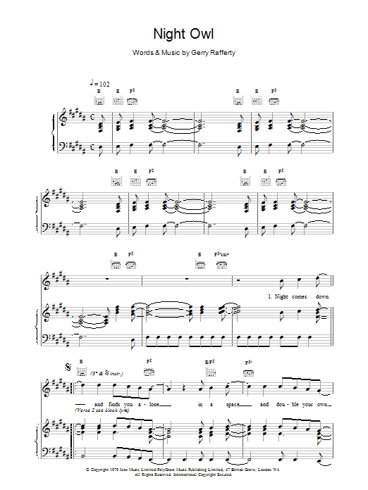 Download or print Gerry Rafferty Night Owl sheet music, chords and digital score arranged for Piano, Vocal & Guitar Chords. This Pop score includes 5 page(s).