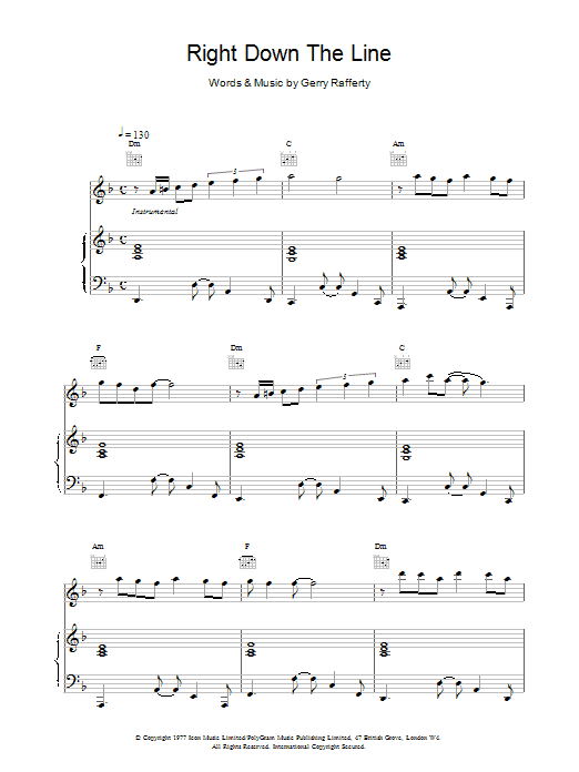Download or print Gerry Rafferty Right Down The Line sheet music, chords and digital score arranged for Piano, Vocal & Guitar Chords (Right-Hand Melody). This Pop score includes 6 page(s).