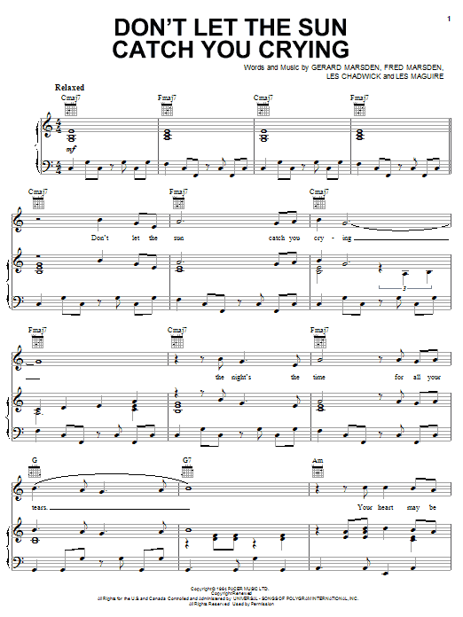 Download or print Gerry & The Pacemakers Don't Let The Sun Catch You Crying sheet music, chords and digital score arranged for Piano, Vocal & Guitar Chords (Right-Hand Melody). This Country score includes 4 page(s).