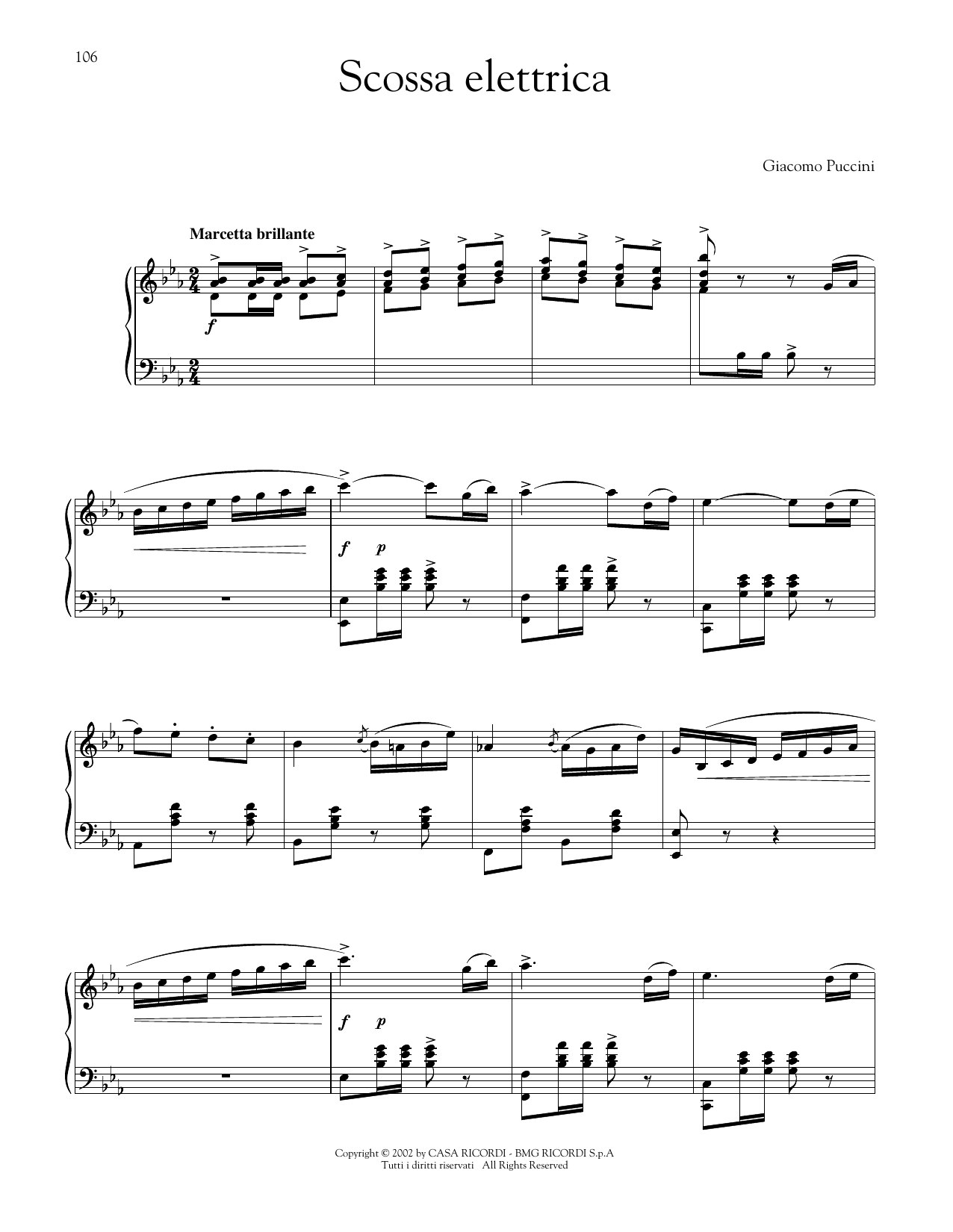 Download or print Giacomo Puccini Scossa elettrica (Electric Shock) sheet music, chords and digital score arranged for Piano Solo. This Opera score includes 5 page(s).