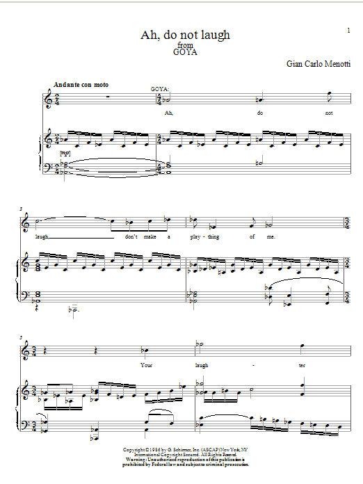 Download or print Gian Carlo Menotti Ah, Do Not Laugh sheet music, chords and digital score arranged for Piano & Vocal. This Classical score includes 6 page(s).