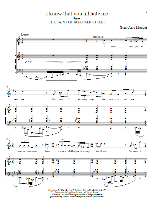Download or print Gian Carlo Menotti I Know That You All Hate Me sheet music, chords and digital score arranged for Piano & Vocal. This Classical score includes 8 page(s).