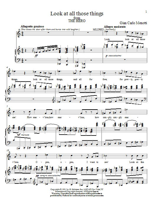 Download or print Gian Carlo Menotti Look At All Those Things sheet music, chords and digital score arranged for Piano & Vocal. This Classical score includes 8 page(s).