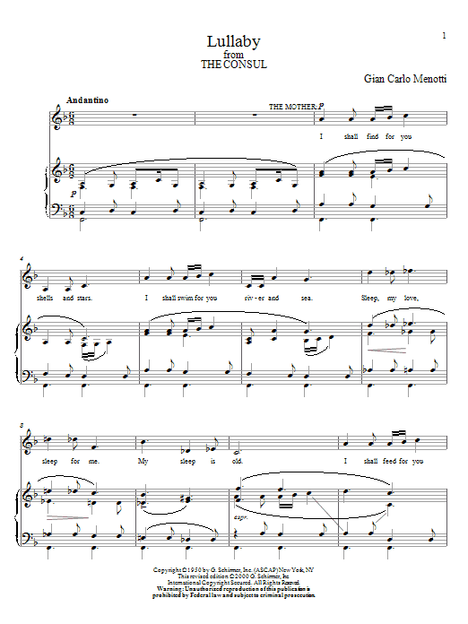 Download or print Gian Carlo Menotti Lullaby sheet music, chords and digital score arranged for Piano & Vocal. This Children score includes 4 page(s).