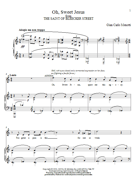 Download or print Gian Carlo Menotti Oh, Sweet Jesus sheet music, chords and digital score arranged for Piano & Vocal. This Christian score includes 14 page(s).