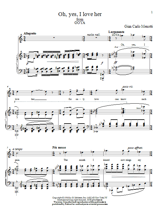Download or print Gian Carlo Menotti Oh, Yes, I Love Her sheet music, chords and digital score arranged for Piano & Vocal. This Classical score includes 4 page(s).