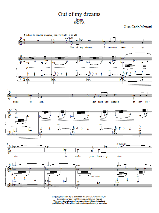 Download or print Gian Carlo Menotti Out Of My Dreams sheet music, chords and digital score arranged for Piano & Vocal. This Classical score includes 5 page(s).