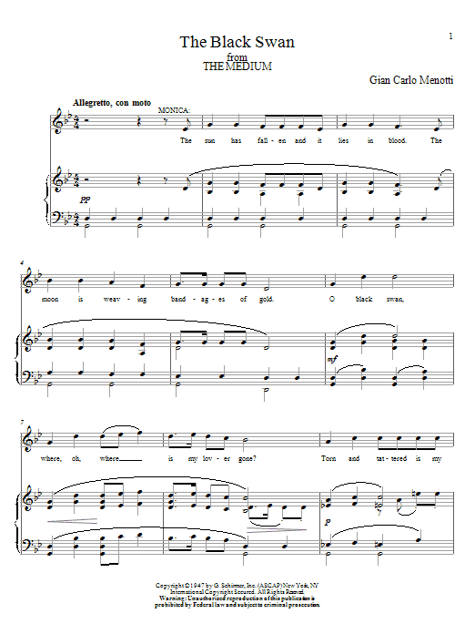 Download or print Gian Carlo Menotti The Black Swan sheet music, chords and digital score arranged for Piano & Vocal. This Classical score includes 5 page(s).