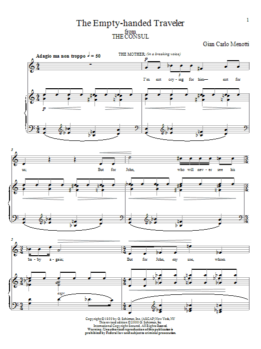 Download or print Gian Carlo Menotti The Empty-handed Traveler sheet music, chords and digital score arranged for Piano & Vocal. This Classical score includes 5 page(s).