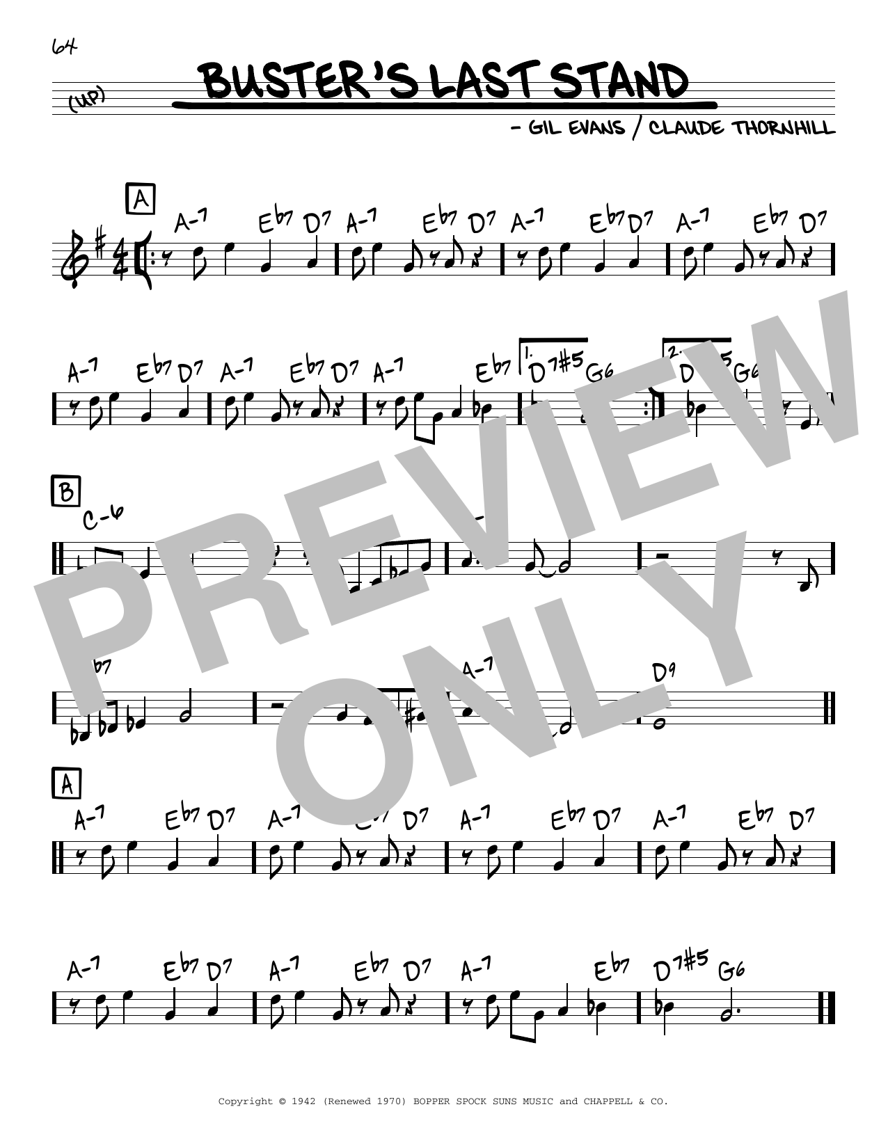 Download or print Gil Evans Buster's Last Stand sheet music, chords and digital score arranged for Real Book – Melody & Chords. This Jazz score includes 1 page(s).