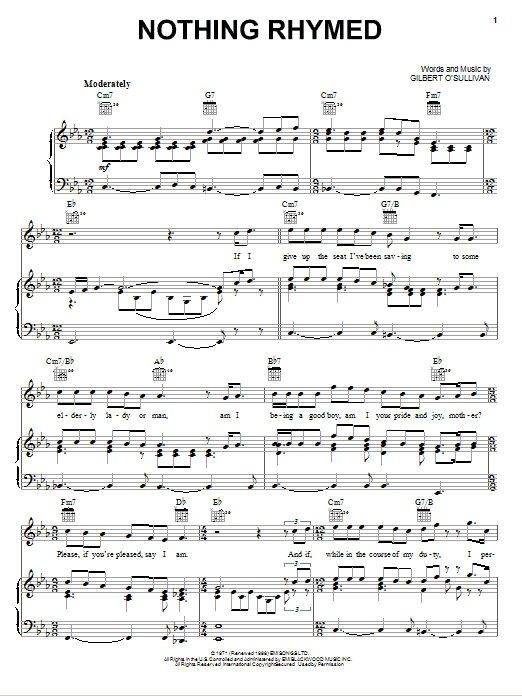 Download or print Gilbert O'Sullivan Nothing Rhymed sheet music, chords and digital score arranged for Piano, Vocal & Guitar Chords (Right-Hand Melody). This Pop score includes 4 page(s).