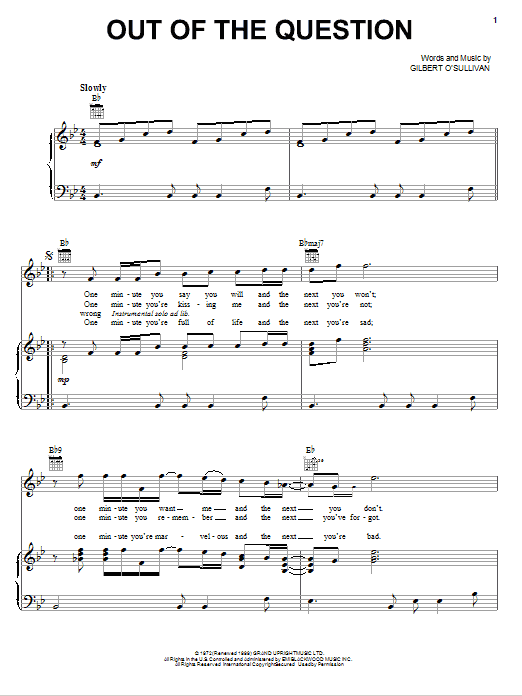 Download or print Gilbert O'Sullivan Out Of The Question sheet music, chords and digital score arranged for Piano, Vocal & Guitar Chords (Right-Hand Melody). This Pop score includes 4 page(s).