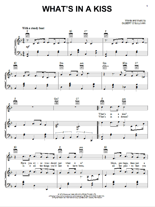 Download or print Gilbert O'Sullivan What's In A Kiss sheet music, chords and digital score arranged for Piano, Vocal & Guitar Chords (Right-Hand Melody). This Pop score includes 4 page(s).