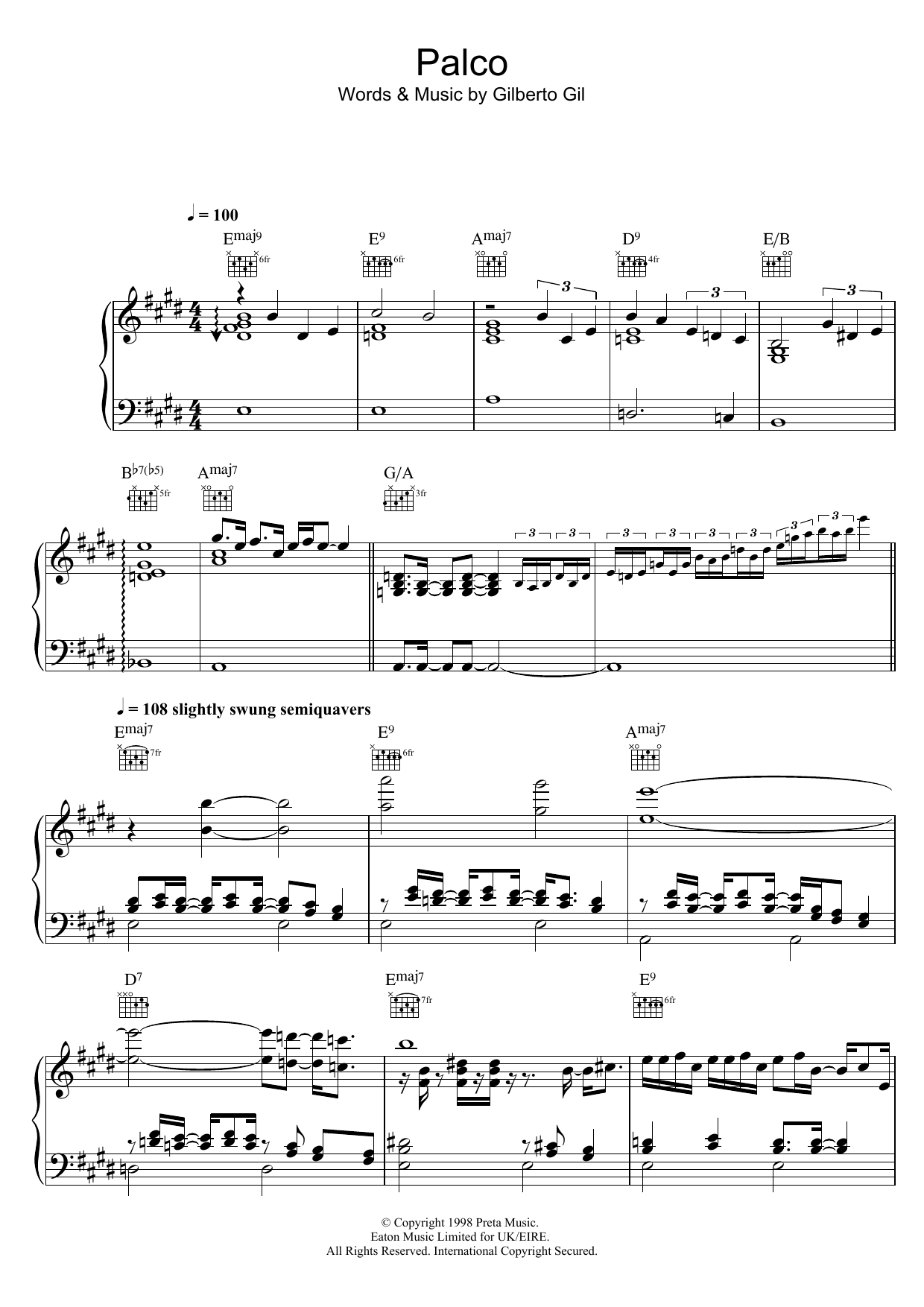 Download or print Gilberto Gil Palco sheet music, chords and digital score arranged for Piano, Vocal & Guitar Chords. This Latin score includes 7 page(s).