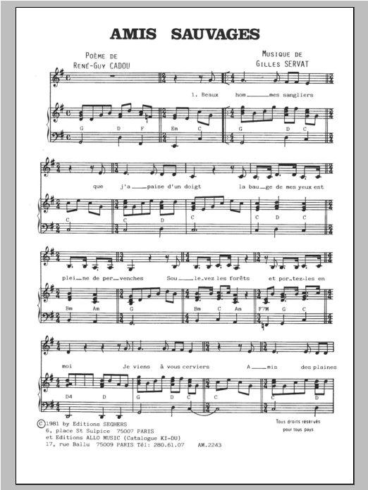 Download or print Gilles Servat Amis Sauvages sheet music, chords and digital score arranged for Piano & Vocal. This Pop score includes 2 page(s).
