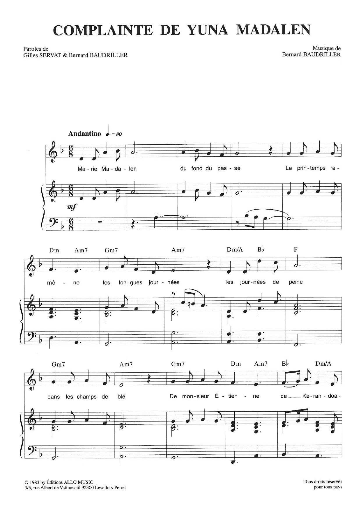 Download or print Gilles Servat Complainte De Yuna Madalen sheet music, chords and digital score arranged for Piano & Vocal. This Pop score includes 3 page(s).