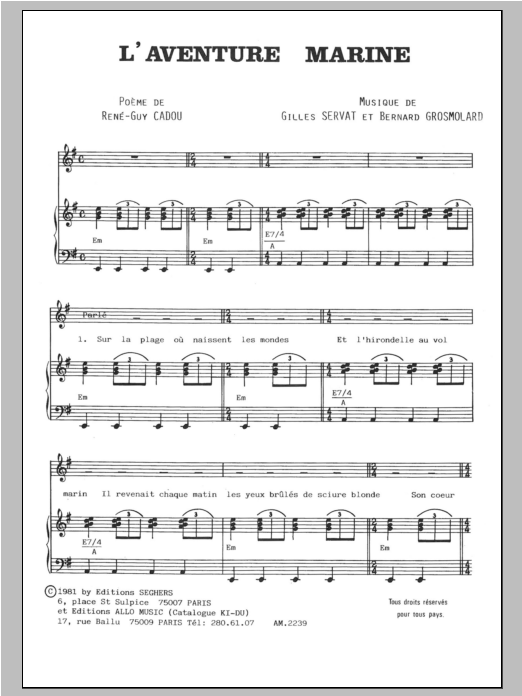 Download or print Gilles Servat L'aventure Marine sheet music, chords and digital score arranged for Piano & Vocal. This Pop score includes 5 page(s).
