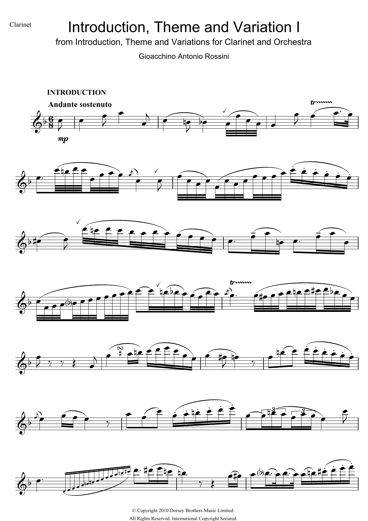 Download or print Gioachino Rossini Introduction, Theme And Variations For Clarinet and Orchestra sheet music, chords and digital score arranged for Clarinet Solo. This Classical score includes 4 page(s).