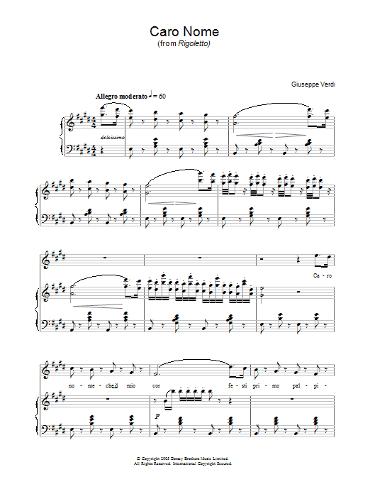 Download or print Giuseppe Verdi Caro Nome (from Rigoletto) sheet music, chords and digital score arranged for Piano, Vocal & Guitar Chords. This Classical score includes 7 page(s).
