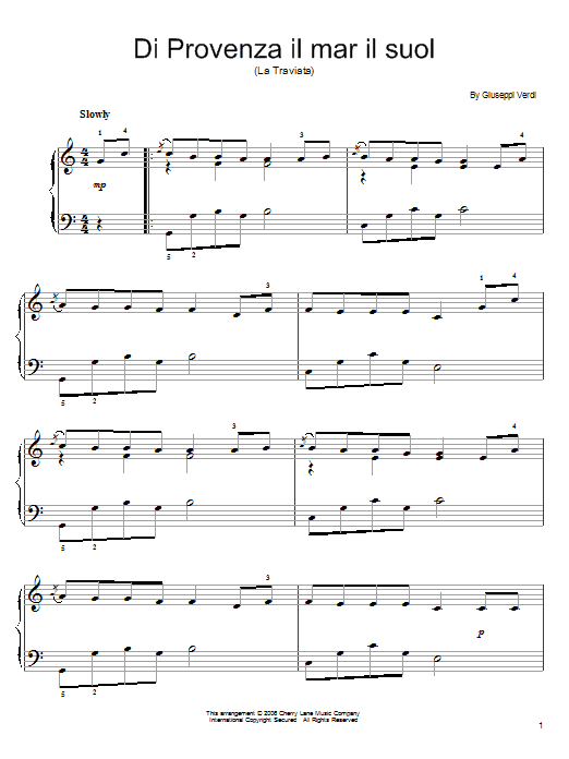 Download or print Giuseppe Verdi Di Provenza Il Mar, Il Suol sheet music, chords and digital score arranged for Piano Solo. This Opera score includes 2 page(s).