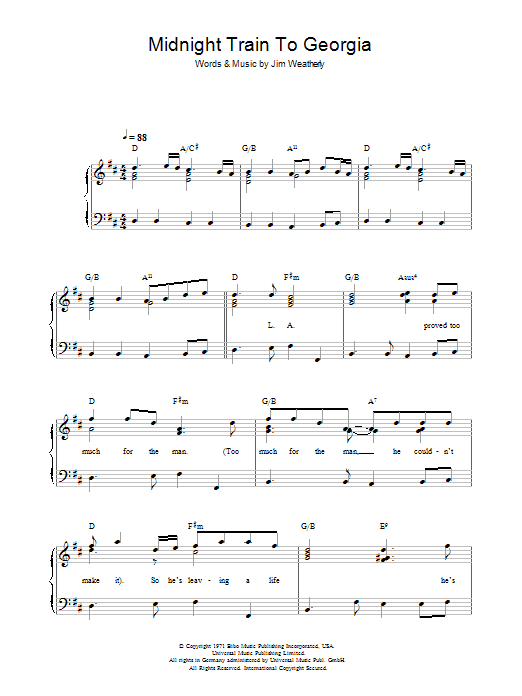 Download or print Gladys Knight & The Pips Midnight Train To Georgia sheet music, chords and digital score arranged for Piano, Vocal & Guitar Chords (Right-Hand Melody). This Pop score includes 6 page(s).