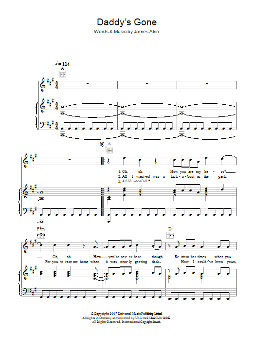 Download or print Glasvegas Daddy's Gone sheet music, chords and digital score arranged for Guitar Chords/Lyrics. This Rock score includes 3 page(s).