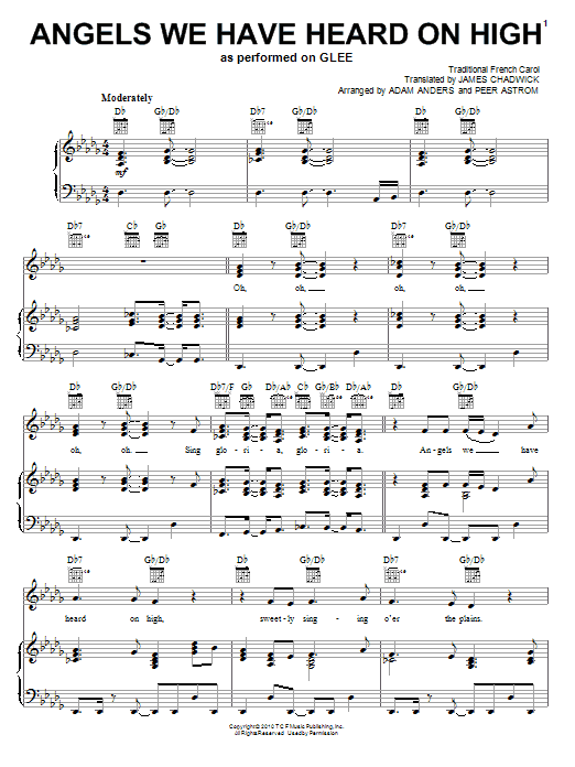 Download or print Glee Cast Angels We Have Heard On High sheet music, chords and digital score arranged for Piano, Vocal & Guitar Chords (Right-Hand Melody). This Pop score includes 8 page(s).