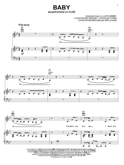 Download or print Glee Cast Baby sheet music, chords and digital score arranged for Piano, Vocal & Guitar Chords (Right-Hand Melody). This Film/TV score includes 8 page(s).