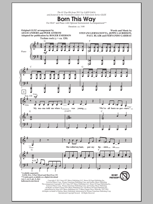 Download or print Roger Emerson Born This Way sheet music, chords and digital score arranged for 3-Part Mixed Choir. This Pop score includes 5 page(s).