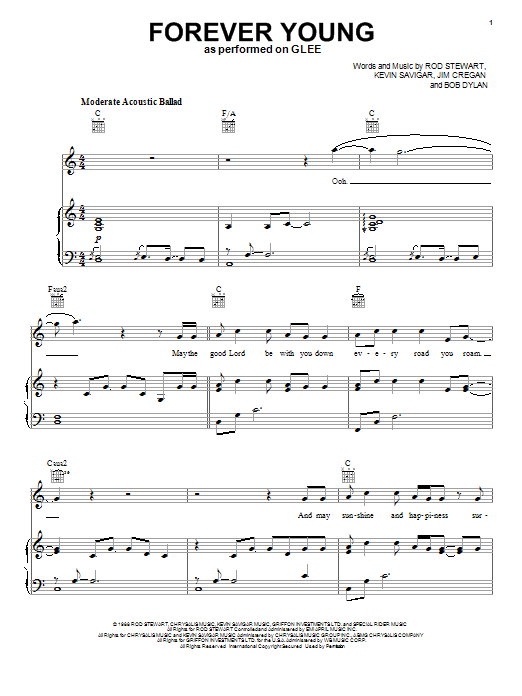 Download or print Glee Cast Forever Young sheet music, chords and digital score arranged for Piano, Vocal & Guitar Chords (Right-Hand Melody). This Pop score includes 7 page(s).