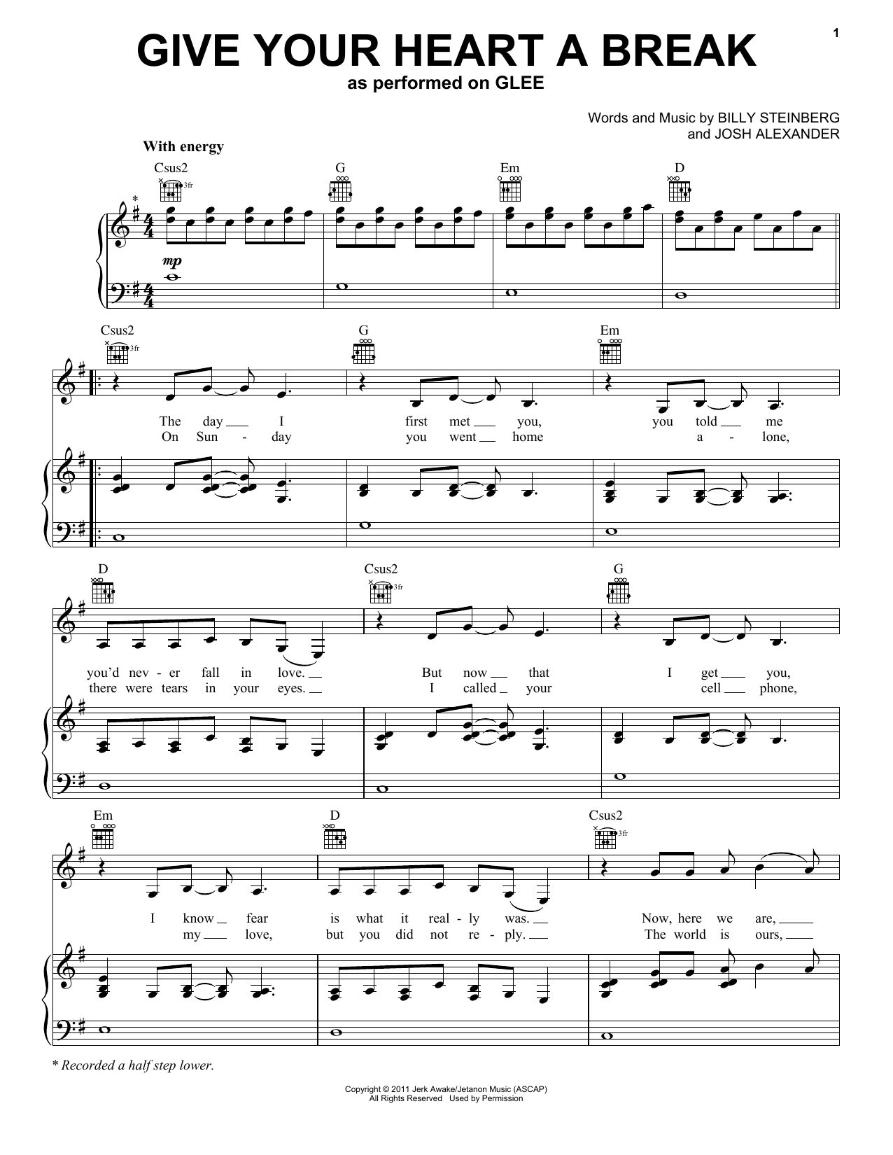 Download or print Glee Cast Give Your Heart A Break sheet music, chords and digital score arranged for Piano, Vocal & Guitar Chords (Right-Hand Melody). This Pop score includes 6 page(s).