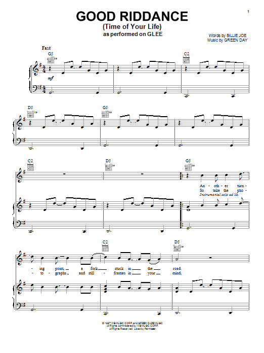 Download or print Glee Cast Good Riddance (Time Of Your Life) sheet music, chords and digital score arranged for Piano, Vocal & Guitar Chords (Right-Hand Melody). This Pop score includes 5 page(s).
