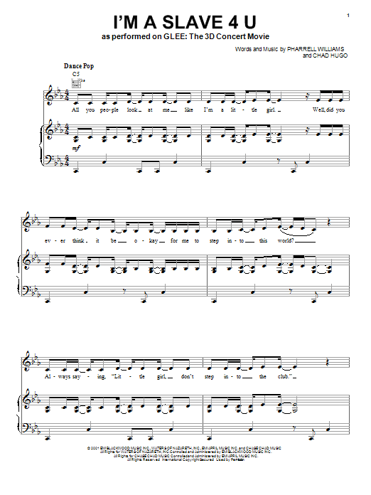 Download or print Glee Cast I'm A Slave 4 U sheet music, chords and digital score arranged for Piano, Vocal & Guitar Chords (Right-Hand Melody). This Film/TV score includes 6 page(s).