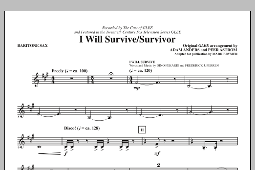 Download or print Glee Cast I Will Survive/Survivor (arr. Mark Brymer) - Baritone Sax sheet music, chords and digital score arranged for Choir Instrumental Pak. This Disco score includes 1 page(s).
