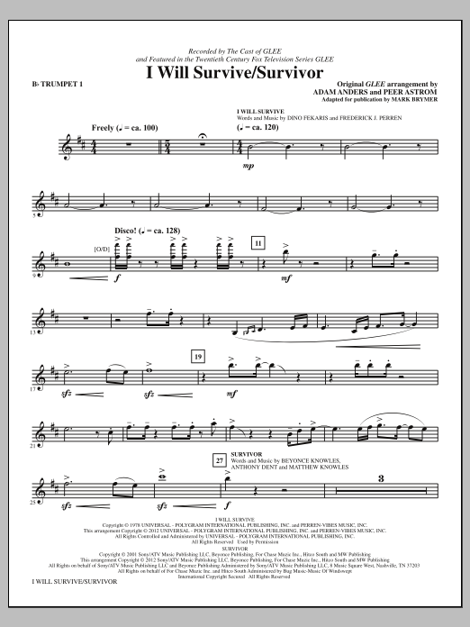 Download or print Glee Cast I Will Survive/Survivor (arr. Mark Brymer) - Bb Trumpet 1 sheet music, chords and digital score arranged for Choir Instrumental Pak. This Disco score includes 3 page(s).