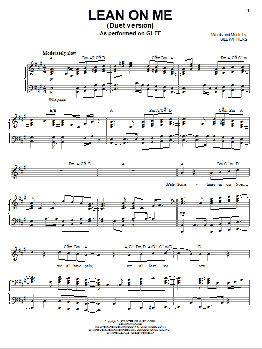 Download or print Glee Cast Lean On Me (Vocal Duet) sheet music, chords and digital score arranged for Piano & Vocal. This Film/TV score includes 10 page(s).