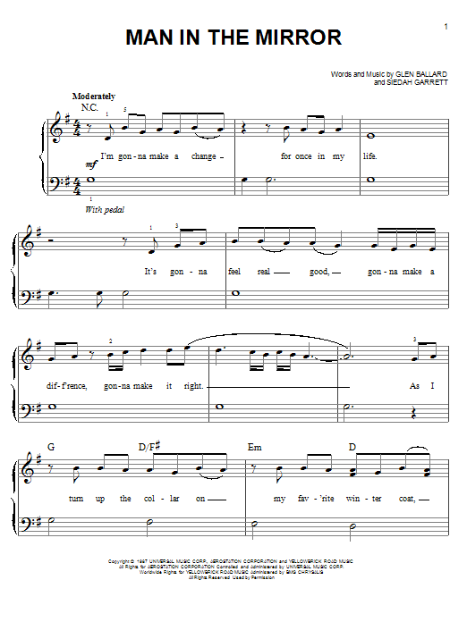 Download or print Glee Cast Man In The Mirror sheet music, chords and digital score arranged for Easy Piano. This Rock score includes 6 page(s).