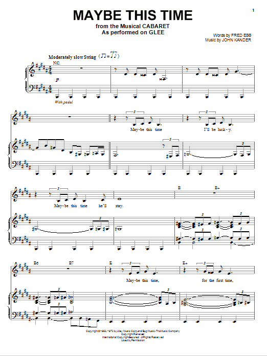 Download or print Glee Cast Maybe This Time sheet music, chords and digital score arranged for Piano & Vocal. This Broadway score includes 6 page(s).