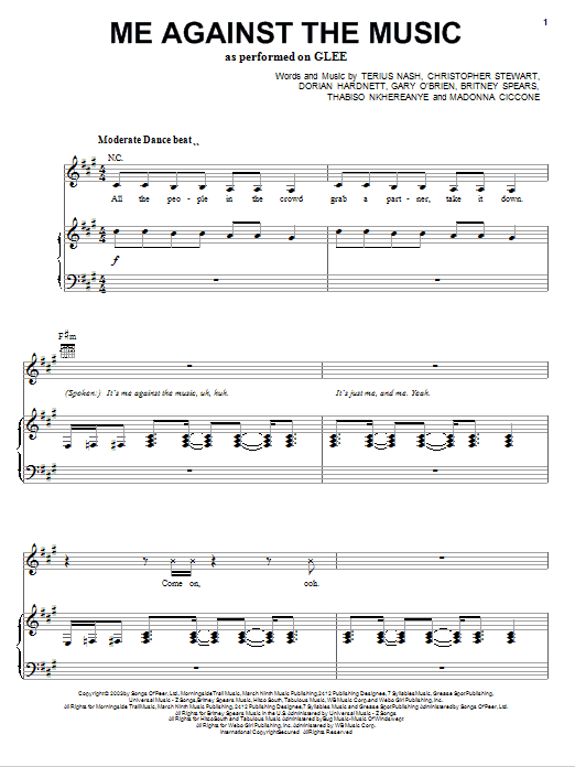 Download or print Glee Cast Me Against The Music sheet music, chords and digital score arranged for Piano, Vocal & Guitar Chords (Right-Hand Melody). This Film/TV score includes 10 page(s).