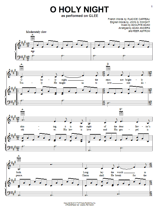 Download or print Glee Cast O Holy Night sheet music, chords and digital score arranged for Easy Piano. This Pop score includes 6 page(s).