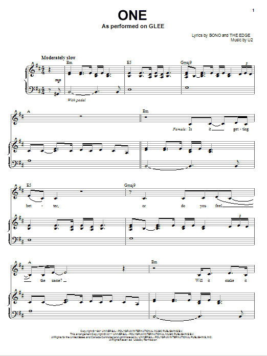 Download or print Glee Cast One (Vocal Duet) sheet music, chords and digital score arranged for Piano & Vocal. This Pop score includes 11 page(s).