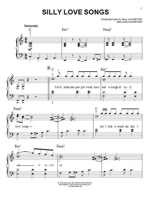 Download or print Glee Cast Silly Love Songs sheet music, chords and digital score arranged for Easy Piano. This Film/TV score includes 7 page(s).